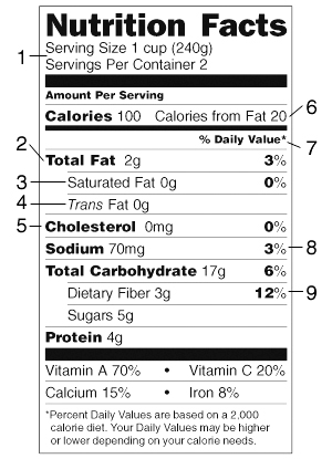 Understanding Food Labels | Nutrition facts, ingredients ... - Health Pages The food label also compares the amount of nutrients in one serving of the food with the amounts of total fat, carbohydrate, dietary fiber, protein, vitamins and minerals that should be present in a 2,000 and 2,500 calorie daily diet. The nutrients are based on a dietary standard called the Daily Value.